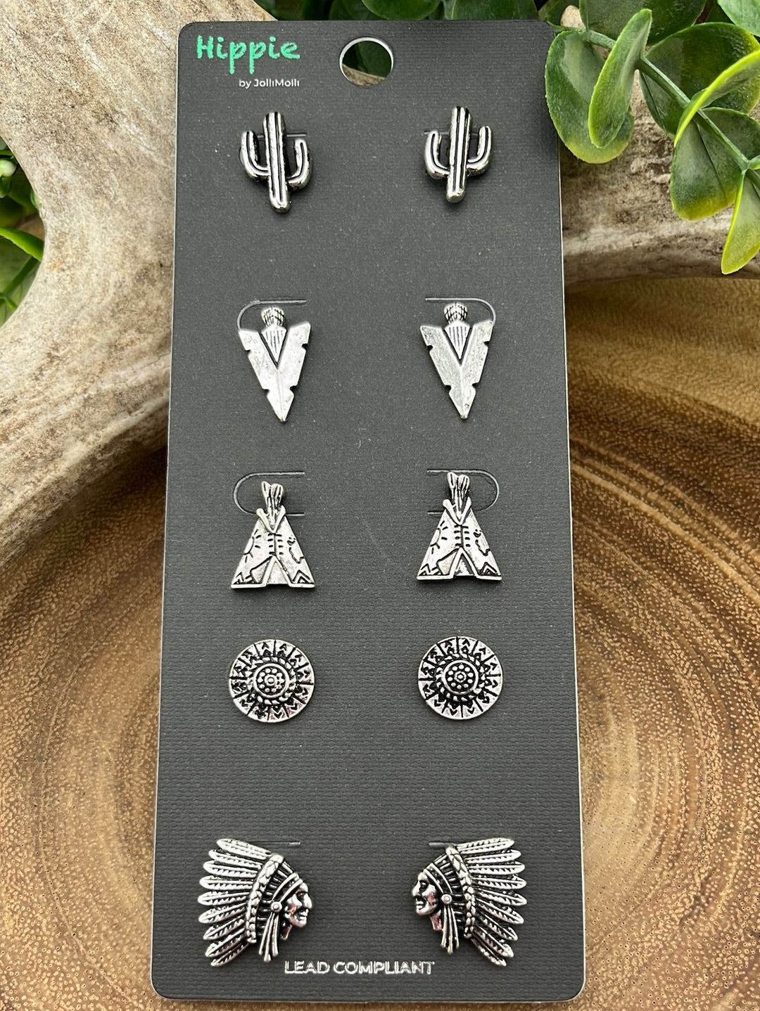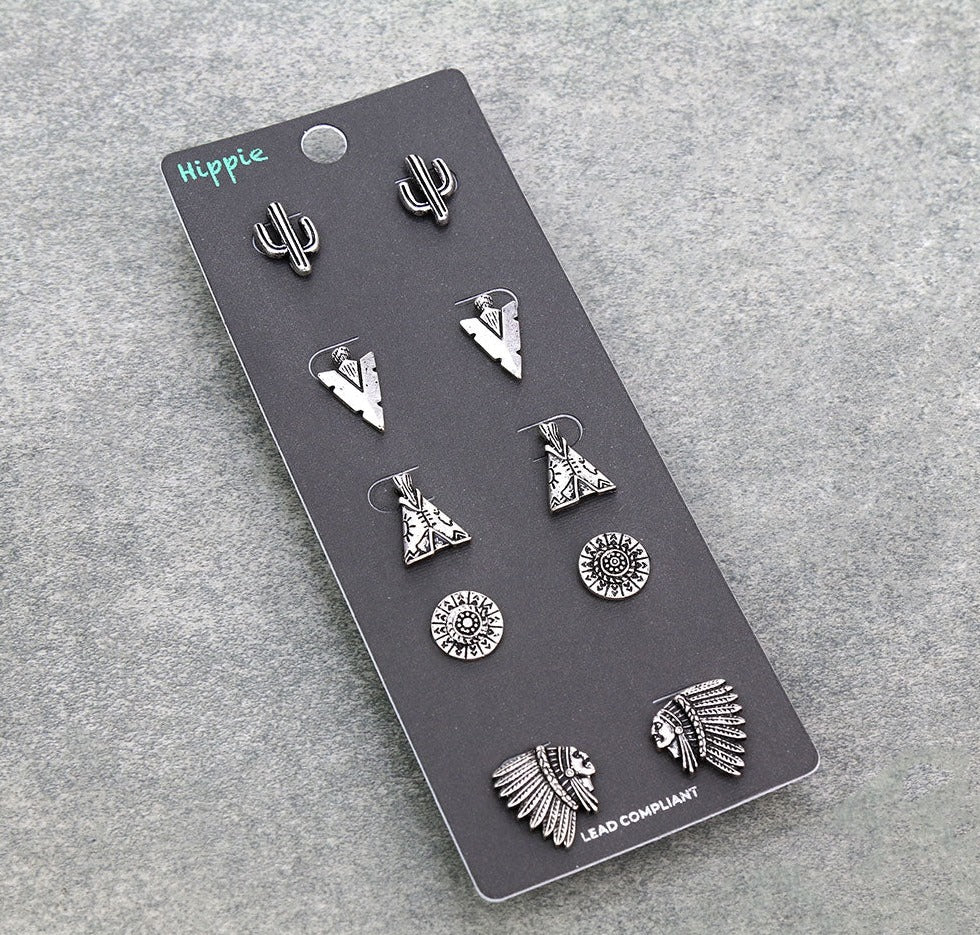 Fashion Silver Indian Cactus Themed Earring Set - 5 pairs