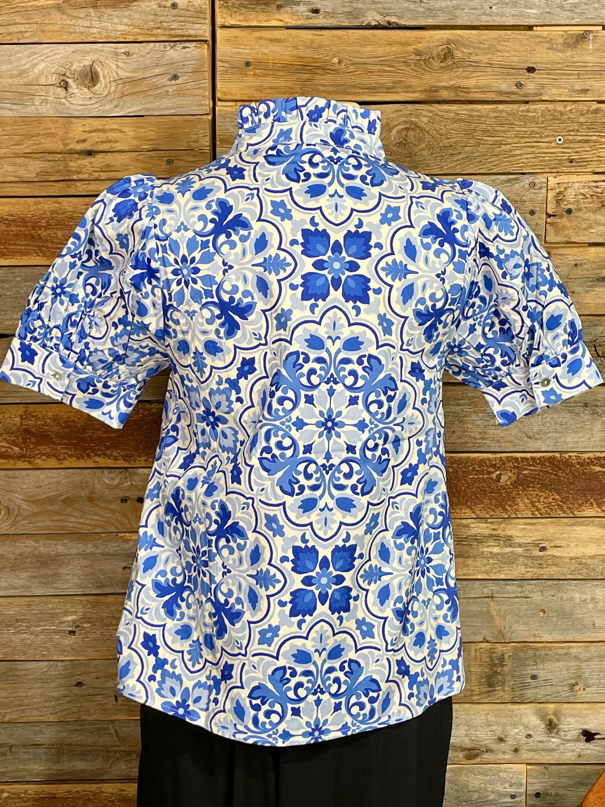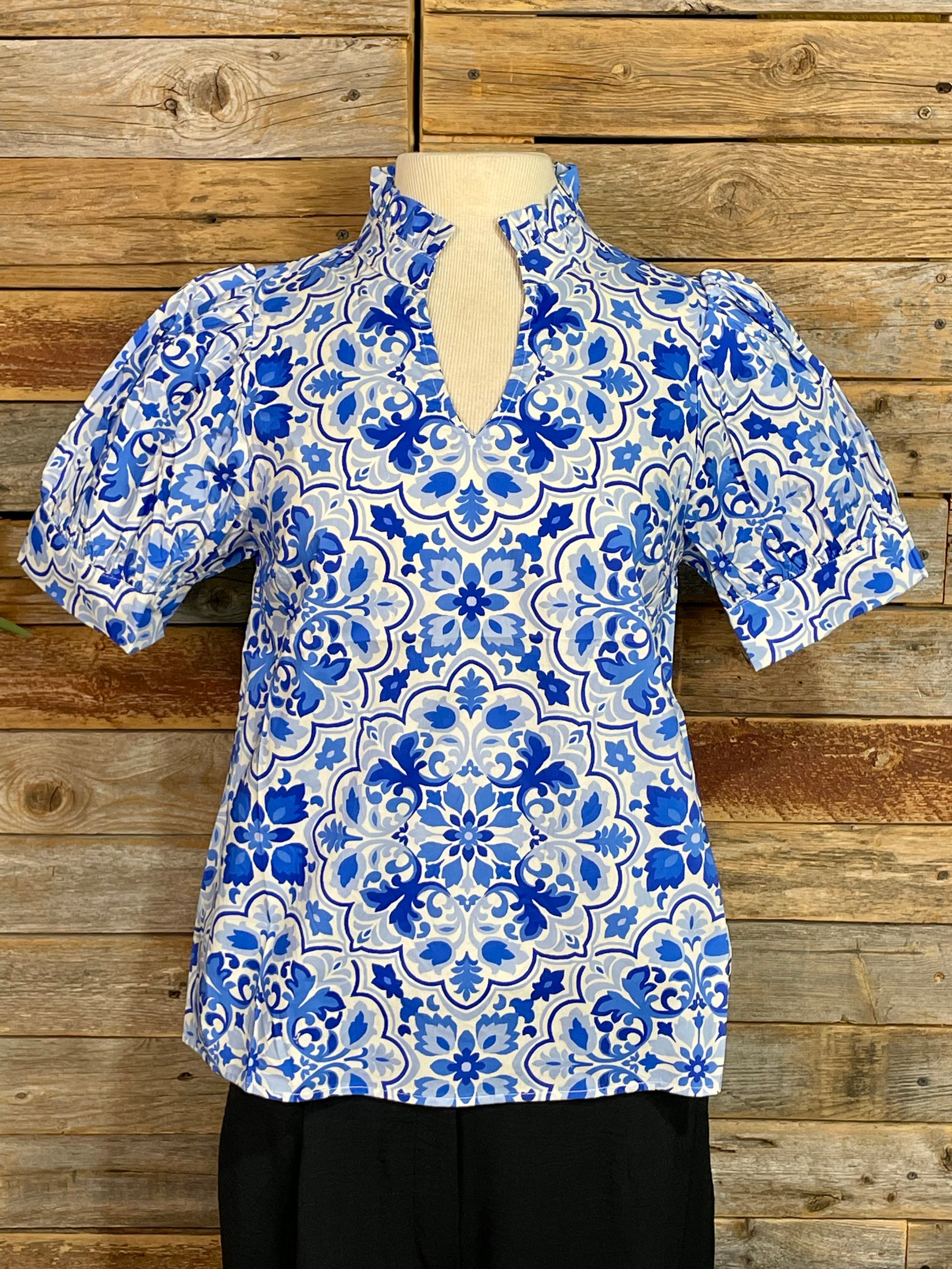 Floral charm meets everyday comfort in this delightful royal blue top! Featuring a cheerful blue and white botanical print, it's designed with a flattering V-neckline and playful ruffle collar detail. The breezy short sleeves make it perfect for warm weather styling, while the soft 100% cotton fabric keeps you feeling fresh and fabulous all day long.