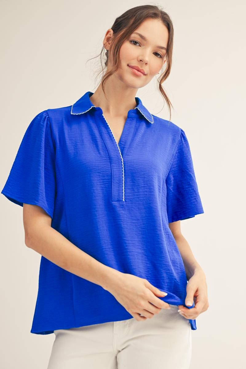 Elevate your wardrobe with this charming Kelly crinkle top, featuring delicate embroidered scallop detailing along the neckline. The classic collar and gathered shoulders create a flattering silhouette, while the textured crinkle fabric adds effortless dimension to any outfit. Short sleeves keep it breezy and versatile for year-round styling. Choose between rich red or vibrant royal blue to match your personal aesthetic.
