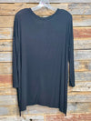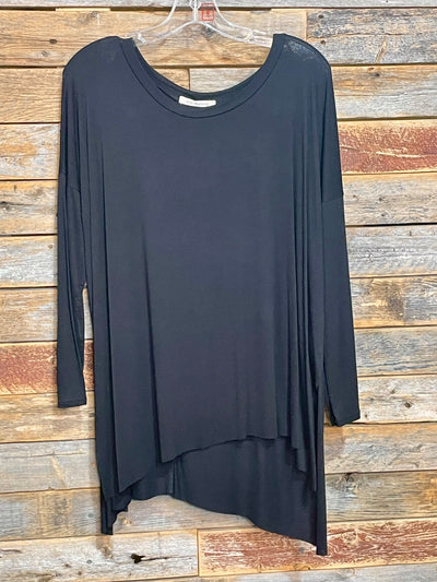 Introducing the Valerie Handkerchief Hem Long Sleeve Top! Its round neck and stretch fabric provide comfort and style, while the flowy, asymmetrical design adds a touch of elegance. Perfect for any occasion, this black top is a must-have.