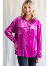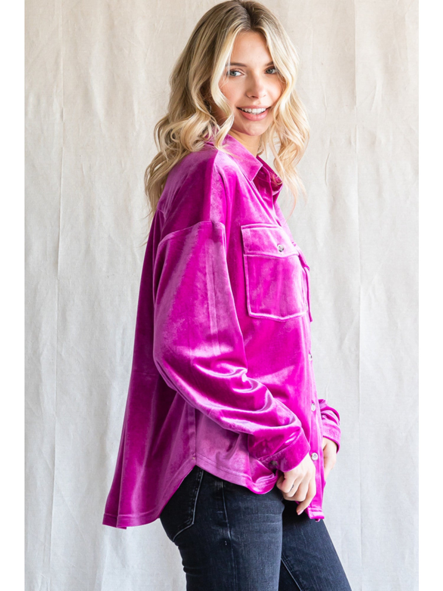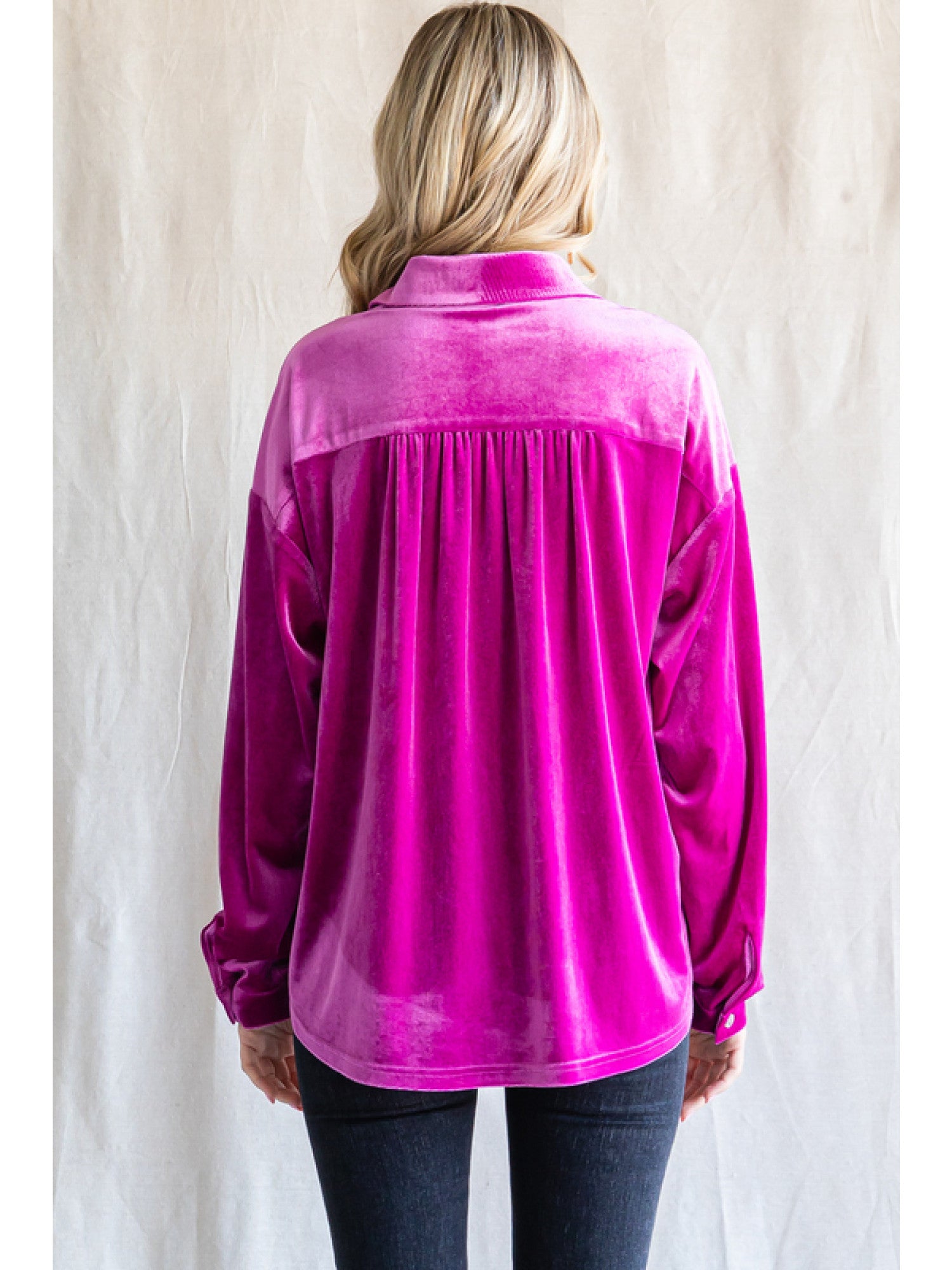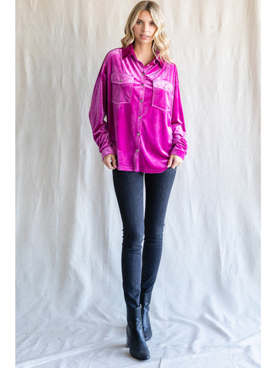 Look effortlessly stylish in this plush velvet blouse! Rich velvet, double chest pockets and button-front style make it perfect for any occasion, while long kimono sleeves, drop shoulder and back wrinkle detail add a touch of sophistication. Non-sheer and lightweight, this versatile blouse will quickly become a wardrobe staple!